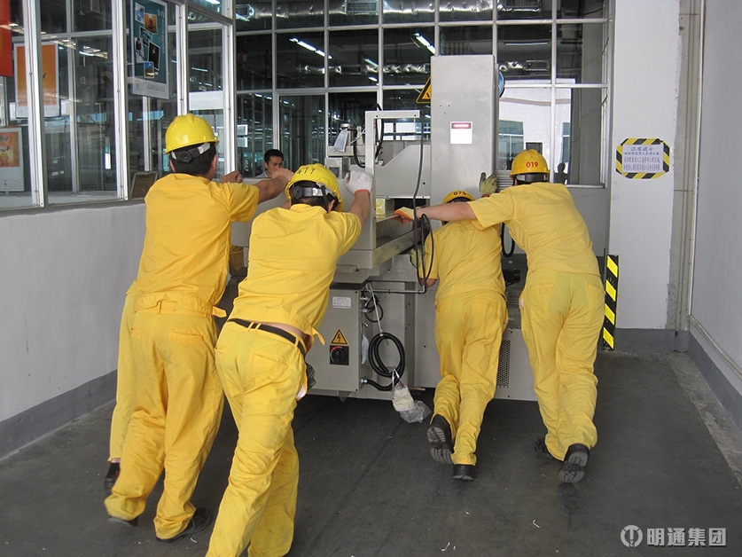 北京明通共達(dá)2014年6月承接了某企業(yè)高精度磨床搬遷項(xiàng)目。項(xiàng)目?jī)?nèi)容包括高精度磨床的掏柜、拆箱、吊裝、移位及定位。整個(gè)項(xiàng)目作業(yè)難點(diǎn)為3點(diǎn):(1)設(shè)備本身受限。設(shè)備拆箱后本來(lái)可以用叉車卸車,但是因?yàn)樵O(shè)備底部沒(méi)有空隙叉齒無(wú)法進(jìn)入,只能用吊機(jī)吊裝卸車,為了保護(hù)設(shè)備,我們使用綁帶吊裝設(shè)備。(2)移位通道受限。設(shè)備擺放地點(diǎn)在廠房?jī)?nèi)的某個(gè)車間內(nèi)部,需要經(jīng)過(guò)幾道門口,門口通道狹窄,叉車無(wú)法直接進(jìn)入作業(yè),只能采取人工移位的方式將設(shè)備移入。(3)客戶要求高??蛻魧?duì)設(shè)備和廠房地面要求高,故在作業(yè)時(shí),我們必須時(shí)刻采取措施保護(hù)好設(shè)備與地面,如:叉車作業(yè)時(shí)在叉齒與設(shè)備間使用模板隔離;吊裝是使用綁帶保護(hù)等。盡管有諸多難點(diǎn), 明通的作業(yè)團(tuán)隊(duì)嫻熟的使用吊機(jī)與叉車配合作業(yè)的方案安全快速的完成了此次項(xiàng)目,得到客戶的大力稱贊。