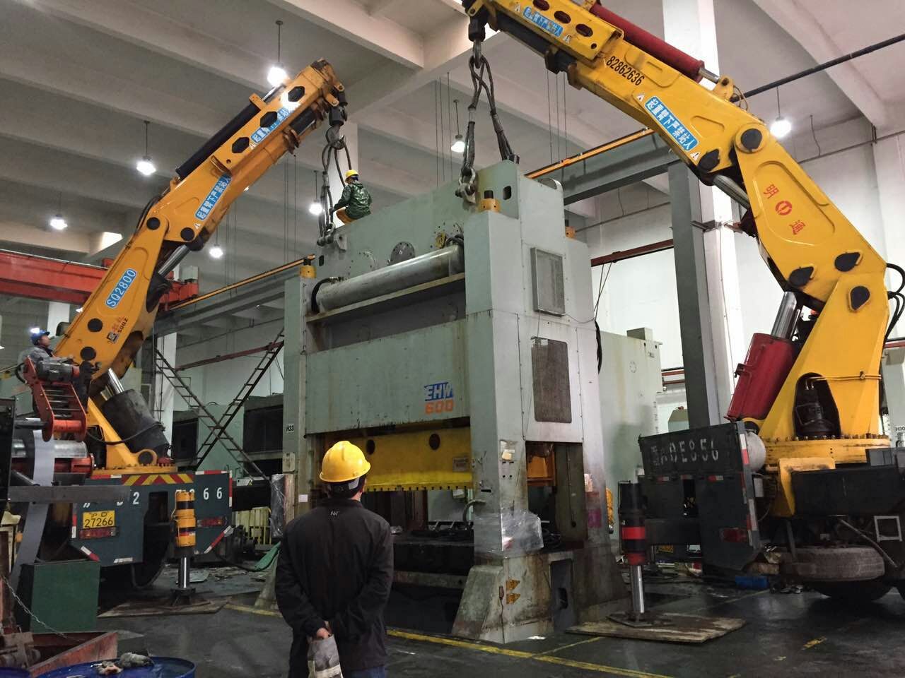 公司2015年承接了江門杰森堡機械制造有限公司的雕銑機搬運項目。作業(yè)內容為將13噸雕銑機搬運至指定地點。此次作業(yè)有以下幾個難點:(1)運輸方面:設備需要從江門蓬江區(qū)運輸?shù)綇V州白云區(qū),路程距離長,有100多公里,且設備底座為多層階梯式,重心不穩(wěn),較難固定。只能用鐵葫蘆鐵鏈把四個角固定,底座墊木板,另用木方制作八個簡易架腳,使設備能保持一個水平位置,保持相對平衡。(2)吊裝方面:吊裝空間受限,設備吊裝場地門外是員工停車場,隨車吊活動空間有限,只能縮小隨車吊吊腳的伸展寬度,讓叉車板車配合設備移位和裝車。(3)移位方面:設備移出車間內移位使用明通特制的小坦克進行移位,叉車緩慢的牽引,而廠房門口有一個30°的斜坡,叉車牽引的同時需要隨車吊用鋼絲繩在后面拉住溜尾,以保證安全;設備寬3.5米而門的寬度是3.6米,也就是說只有10公分的活動寬度,這無疑是個挑戰(zhàn),而且移進設備到另一個廠房時外面有三層階梯,難度系數(shù)增加,只能用明通特制的鋼板平臺搭建一個水平平臺,再進行移位操作,靠近門框時工人們用千斤頂給設備做一些細微的左右移動,最后把設備恰到好處的移進了廠房。在夜色來臨前明通人終于完成所有作業(yè)任務,細致認真的明通人以安全周密的作業(yè)完成了客戶要求,作業(yè)技術贏得了客戶的高度贊譽。